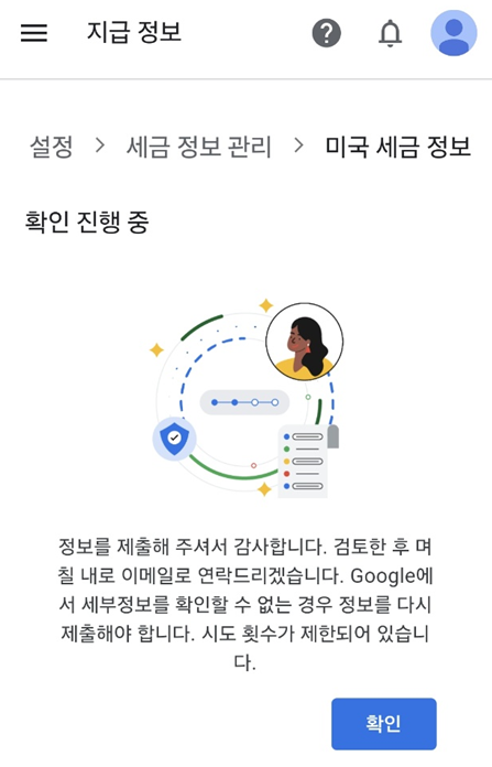 정보를 제출하면 아래와 같이 확인 진행중 메시지가 나오는데요.