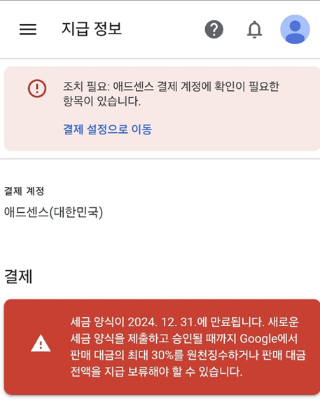 에러 메시지를 클릭해보면 아래처럼 세금 양식이 2024. 12. 31.에 만료됩니다. 새로운 세금 양식을 제출하고 승인될 때까지 Google에서 판매 대금의 최대 30%를 원천징수하거나 판매 대금 전액을 지급 보류해야 할 수 있습니다.