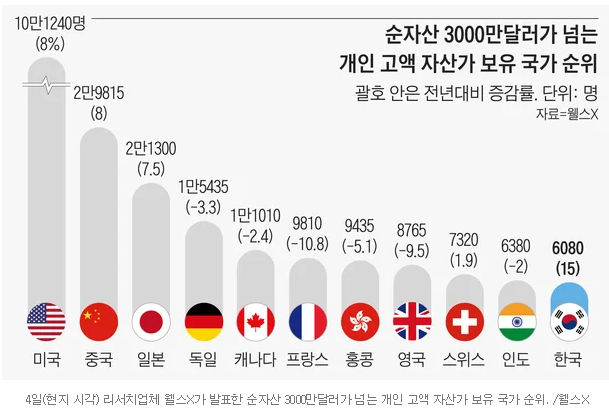지난해 초고액 순자산가가 가장 많은 나라는 미국으로 10만1240명이었다고 합니다. 이어 중국(2만9815명), 일본(2만1300명), 독일(1만5435명), 캐나다(1만1010명), 프랑스(9810명), 홍콩(9435명), 영국(8765명), 스위스(7320명), 인도(6380명)가 10위권 안에 들었습니다.