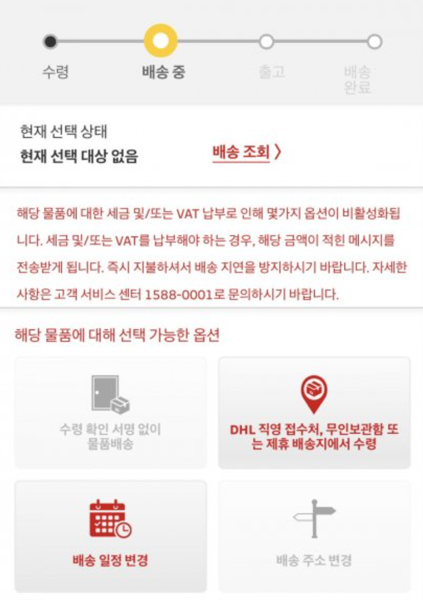 DHL의 경우 배송 지연이 발생할 수 있기 때문에 그리고 저 수취인이 없을 경우 배송지연이 되기 때문에 꼭 비대면 수령을 신청하시기 바랍니다.