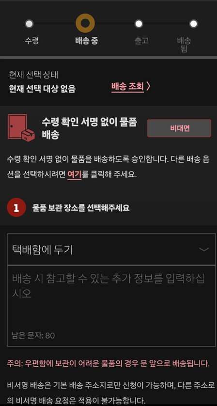 국내까지 와서 서명을 받지 않으면 배송 지연이 발생하기 때문에 비대면 수령을 신청하는 것이 필요합니다.