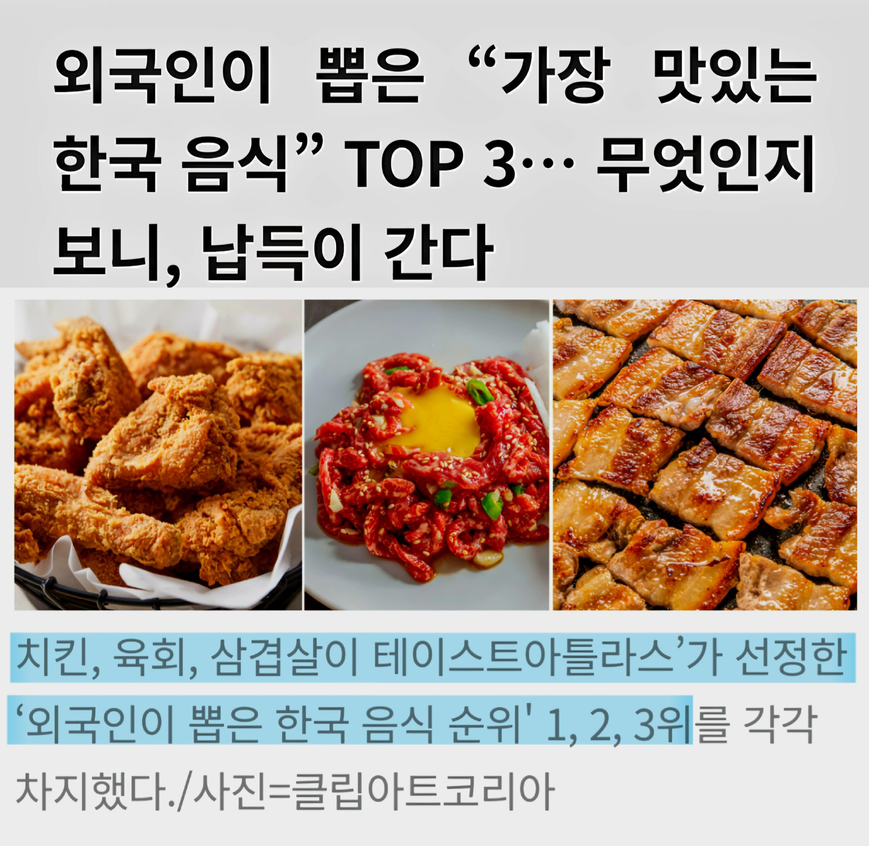글로벌 미식 전문 가이드 ‘테이스트아틀라스’가 선정한 ‘외국인이 뽑은 한국 음식 순위’가 공개됐다고 합니다.