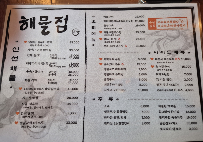 메인 메뉴는 신선한 해물위주로 되어있습니다. 여기에 항정수육도 있구요.