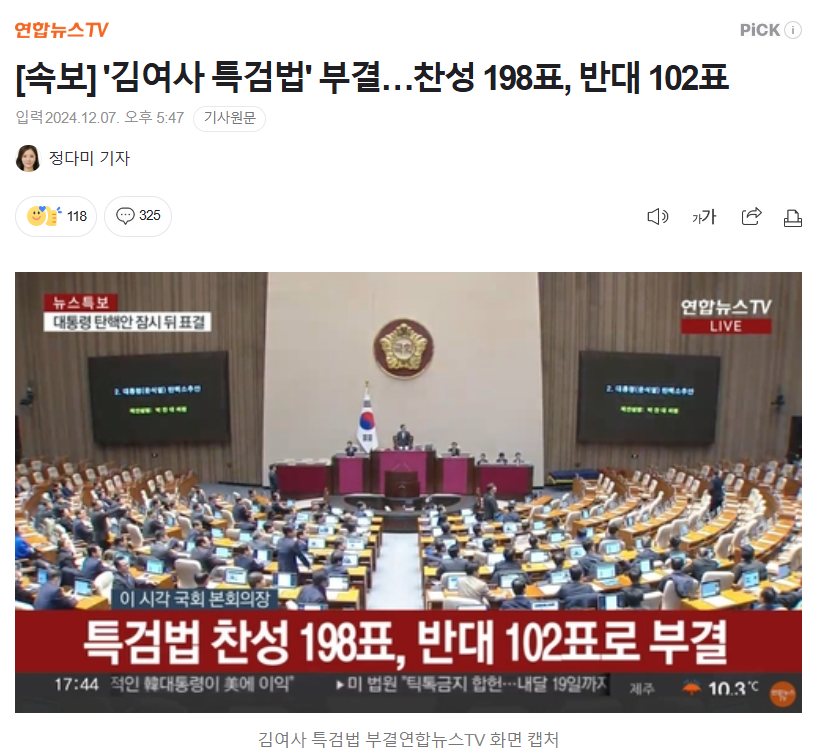 대통령 탄핵안 표결 전 진행된 김건희 여사(김여사) 특검법이 최종 부결되었습니다. 찬성 198표 반대 102표로 결과가 나왔습니다.
