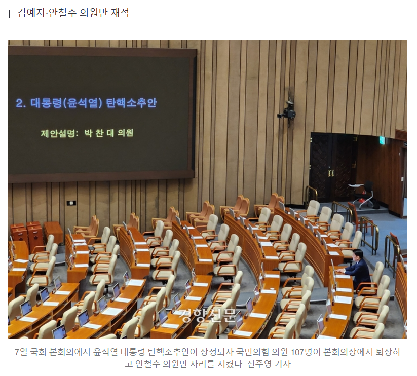 최초 국민의힘 의원 108명 중 안철수 의원을 빼고 107명은 윤석열 대통령 배우자 김건희의 주가조작 사건 등의 진상규명을 위한 특별검사 임명 등에 관한 법률안 부결되자 본회의장을 떠났습니다. 대통령 탄핵소추안은 재적 의원(300명) 3분의 2(200명)가 찬성해야 가결되는데요.