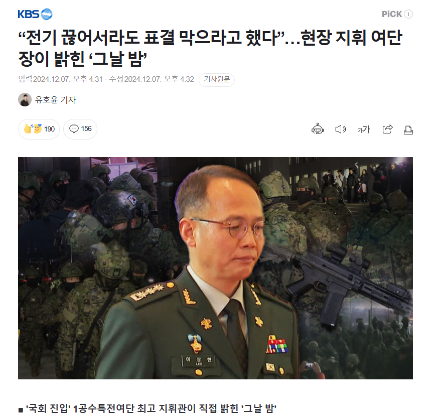 국회에 들어갔던 1공수여단은 12·12 군사 반란에 투입됐던 부대 중 하나입니다. 이 여단장은 자신의 부대가 또다시 정치의 도구가 된 것 같다면서 목이 멘 듯 천천히 자신의 심정을 털어놨습니다. 전기를 끊어서라도 비상계엄 해제 요구 결의안을 막으라는 지시를 받았다고 합니다.