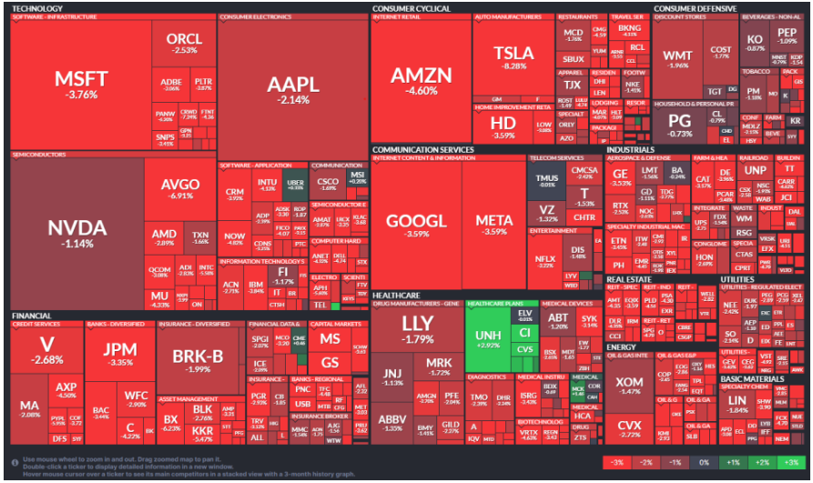 스탠더드앤드푸어스(S&P) 500 지수는 전장보다 178.45포인트(-2.95%) 내린 5872.16에, 기술주 중심의 나스닥 지수는 전장보다 716.37포인트(-3.56%) 하락한 1만9392.69에 각각 마감했습니다.