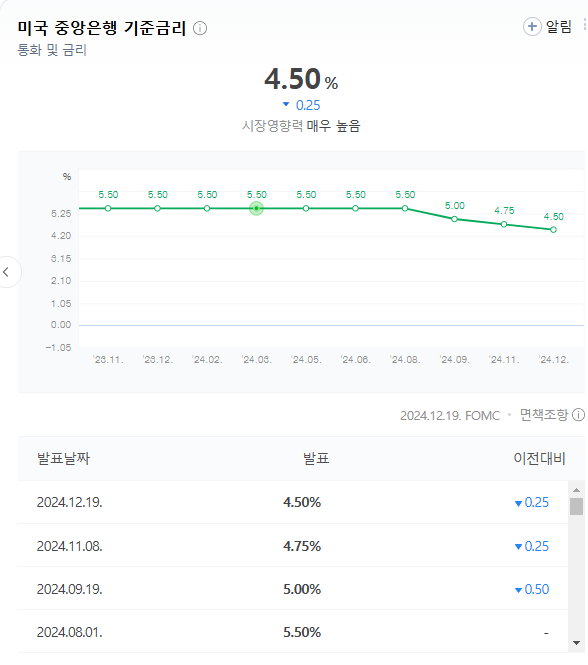 미국 연준이 어제 기준 금리를 4.5로 0.25 인하했습니다.