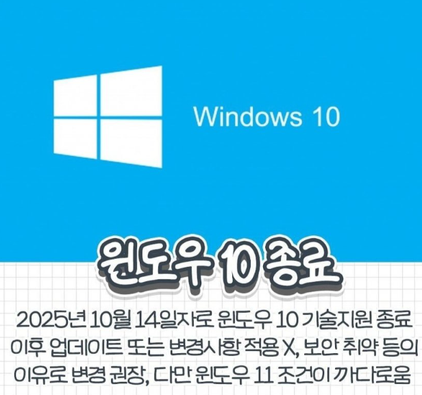 마지막 운영체제라는 윈도우 10이 종료됩니다. 25년 10월 14일자로 기술지원이 종료되는데요.