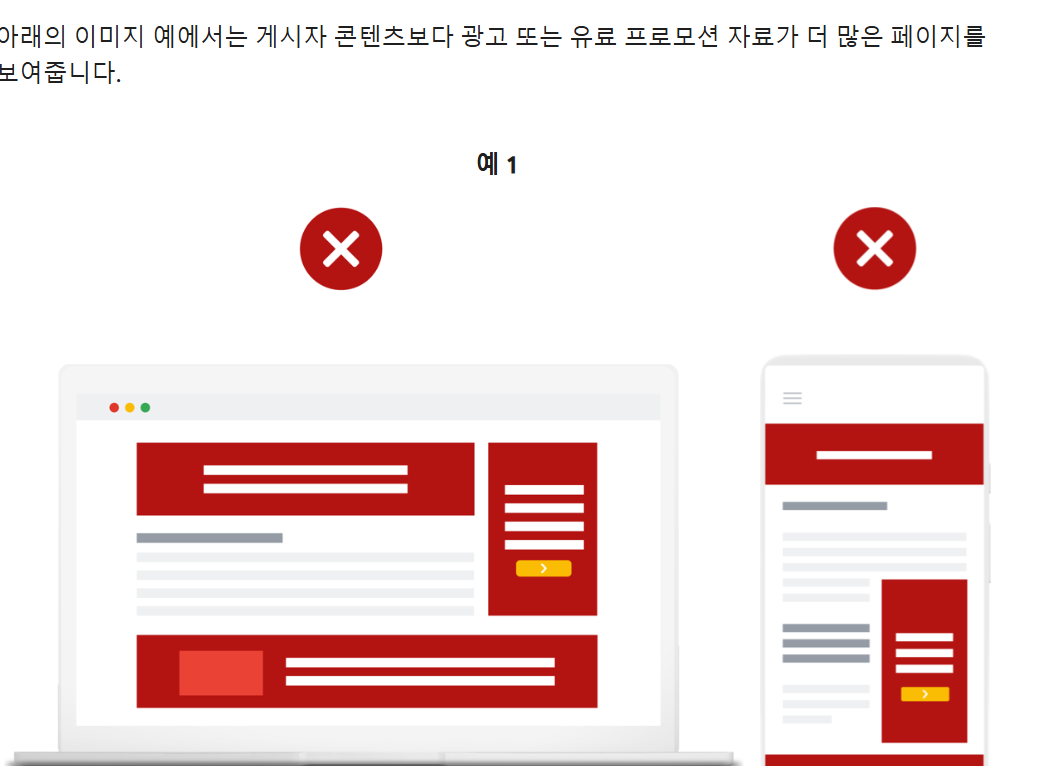 | 웹페이지에 게시자 콘텐츠보다 광고 등 유료 프로모션 자료가 더 많아서는 안 됩니다. 게시자 콘텐츠는 게시자가 만들거나 관리하는 이미지, 동영상, 게임, 기사 텍스트, 사용자 제작 콘텐츠를 포함하지만 공백, 머리글, 바닥글 콘텐츠 또는 사이트 내 다른 콘텐츠로의 링크는 포함하지 않습니다. |
