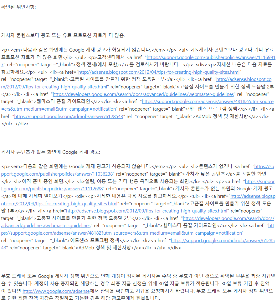 즉 게시자가 만든 콘텐츠보다 광고 또는 유료 프로모션 자료가 많은 경우에 짤리게 된다고 합니다.