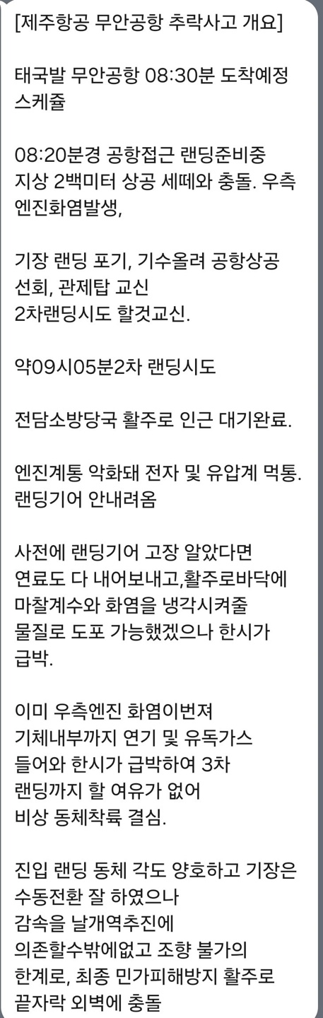 특히 해당 항공기는 바퀴에 해당하는 랜딩기어가 정상적으로 내려오지 않았고 동체 착륙을 시도했다는 정황이 나왔다. 랜딩기어 고장의 원인은 현재까지 '버드 스트라이크(조류 충돌)' 때문이라는 추정이 나왔습니다.