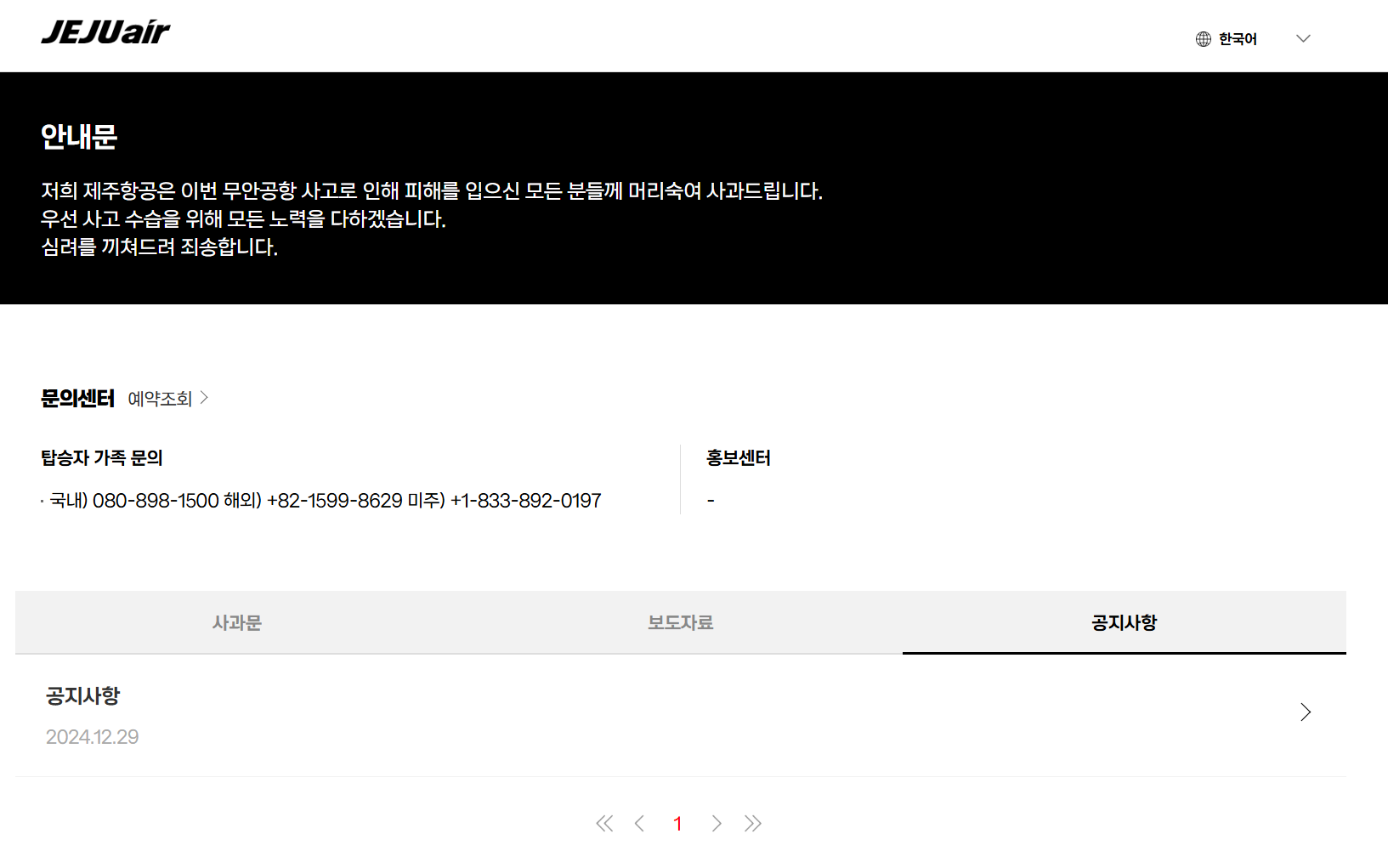 안내문 저희 제주항공은 이번 무안공항 사고로 인해 피해를 입으신 모든 분들께 머리숙여 사과드립니다. 우선 사고 수습을 위해 모든 노력을 다하겠습니다. 심려를 끼쳐드려 죄송합니다.