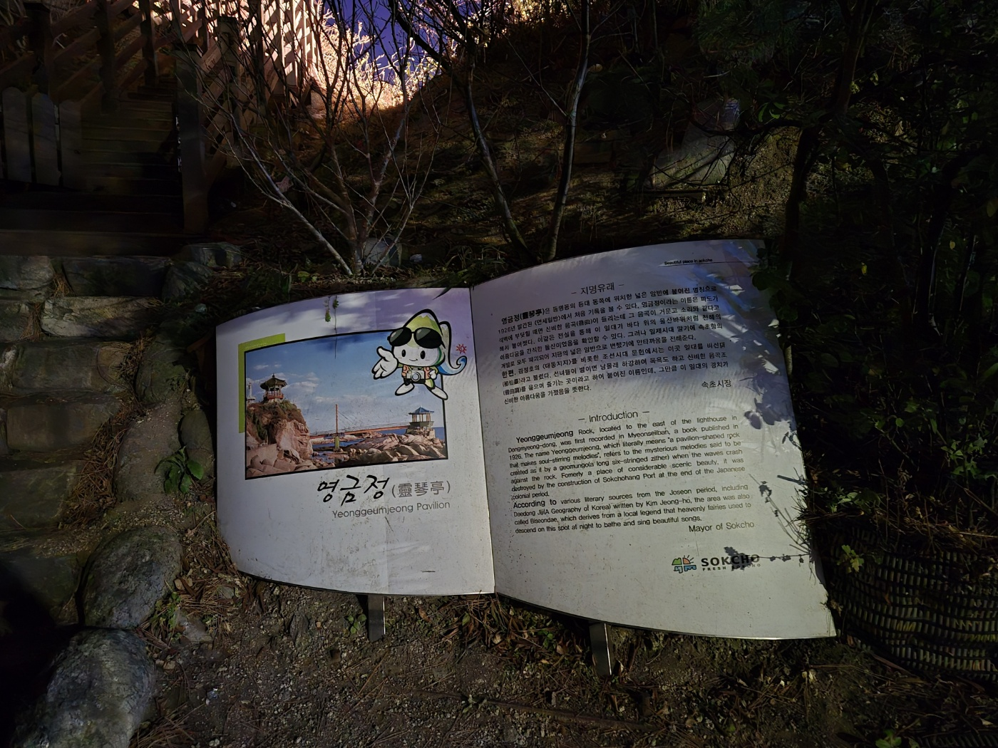 영금정은 속초시 내에서 일출을 보기 가장 좋은 장소 중 하나로 손꼽히고 있는데요. 파도가 바위에 부딪치면 내는 소리가 거문고 소리와 같다고 하여 영금정이라 불린다고 합니다. 일출과 일몰 감상의 명소로 시원한 파도소리를 들으며 한없이 펼쳐진 동해바다를 감상할 수 있습니다.
