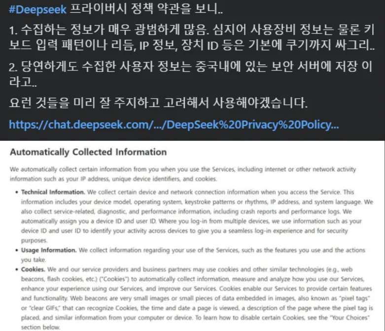 현재 딥시크는 개인정보를 막대하게 수집해 갑니다. 개인정보에 대한 규제가 약한 중국이기 때문에 어쩔수 없이 발생하는 문제이기도 합니다.