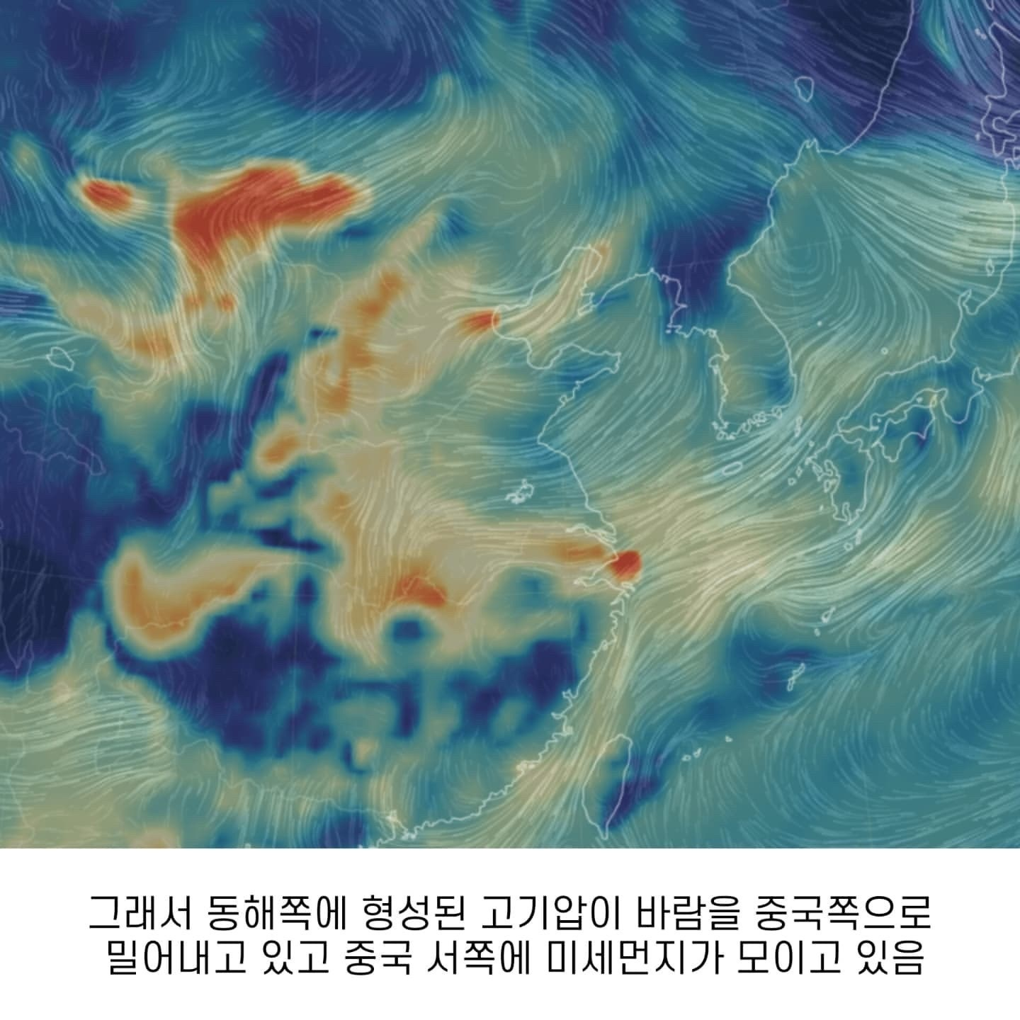그러다 보니 동해쪽에 형성된 고기압이 바람을 중국쪽으로 밀어내고 있어서 중국 서쪽으로 미세먼지가 모이고 있습니다.