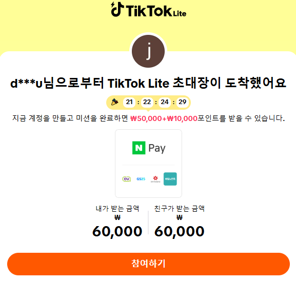 현재 틱톡라이트 신규가입시 6만원을 준다고 합니다. 아래 링크를 통해서 가입하면 되는데요.