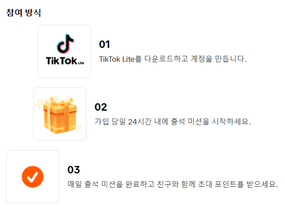 틱톡라이트를 다운로드하고 계정을 만들고 가입 당일 24시간 이내에 출석 미션을 하면 된다고 합니다.