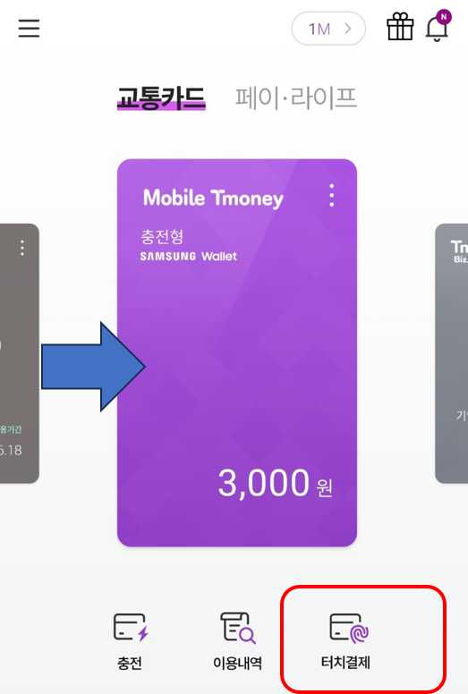 기후동행카드는 따로 조작을 하지 않아도 되지만, 별도 카드를 사용할때는 터치결제를 통해서 화면을 활성화 해야합니다.