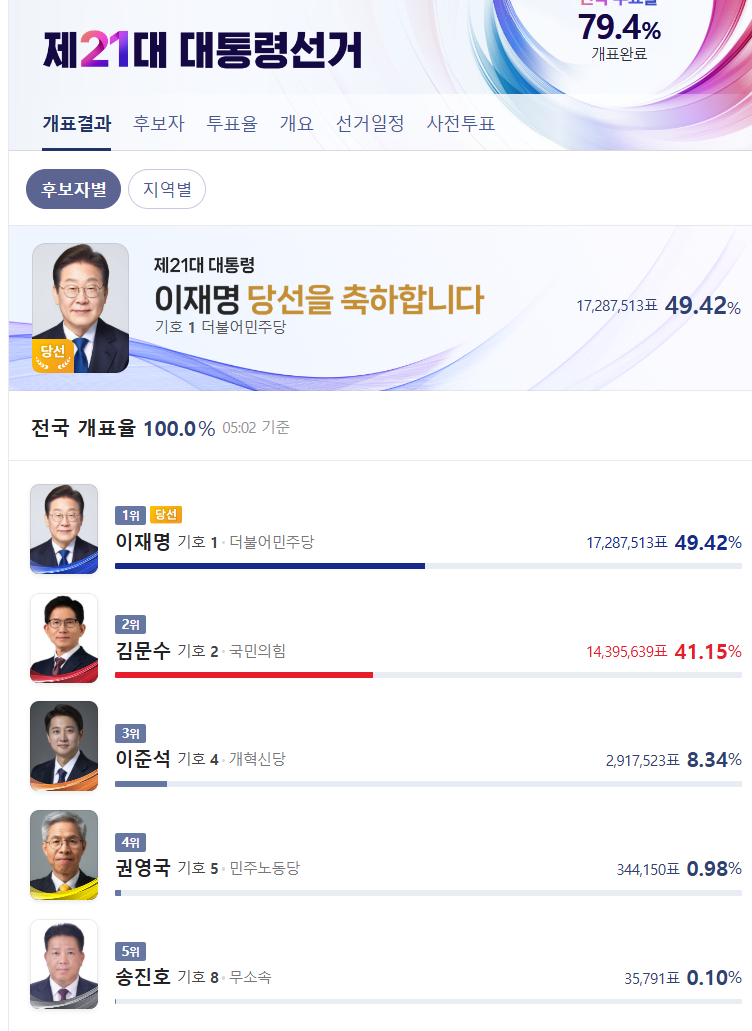 이재명 대통령이 49.42%로 당선되었구요. 2위는 김문수 후보로 41.15%, 3위는 이준석 후보로 8.34%입니다.