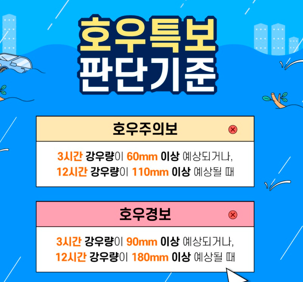 호우경보는 3시간 강우량이 90㎜ 이상 예상되거나 12시간 강우량이 180㎜ 이상 예상될 때 발령됩니다.