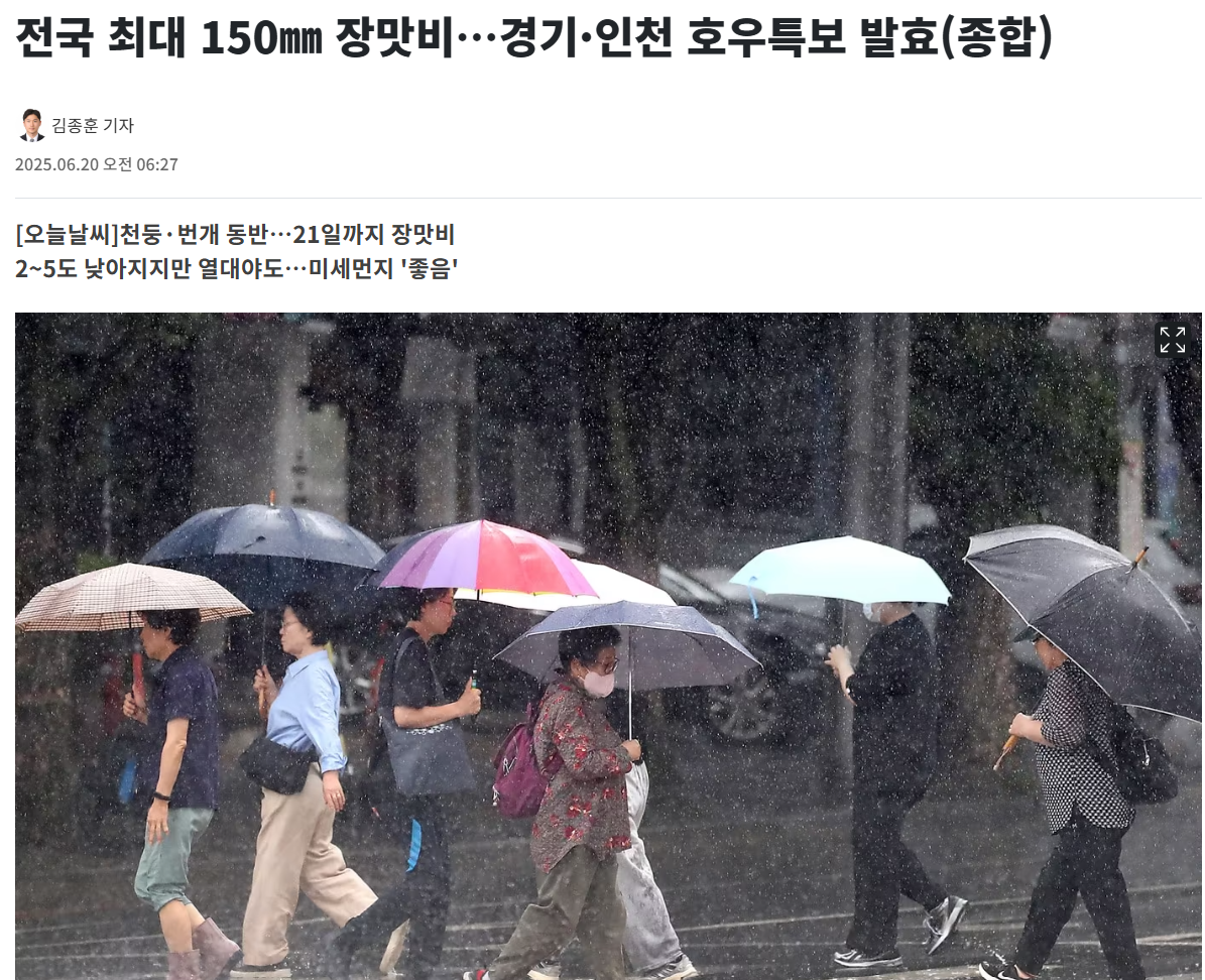 현재 전국 대부분 지역에 돌풍과 천둥·번개를 동반한 매우 많은 비가 내리고 있는데요. 일부 지역에는 최대 150㎜ 비가 내릴 전망이라고 합니다.