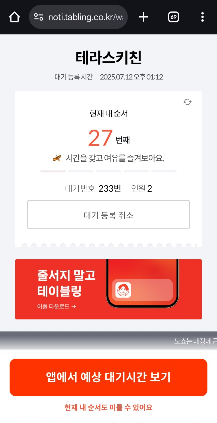 캐치테이블에 등록하시면 되구요. 주말 기준으로 약 50번의 대기열이 있었습니다. 들어가는데는 한 시간 정도가 걸린것 같네요.