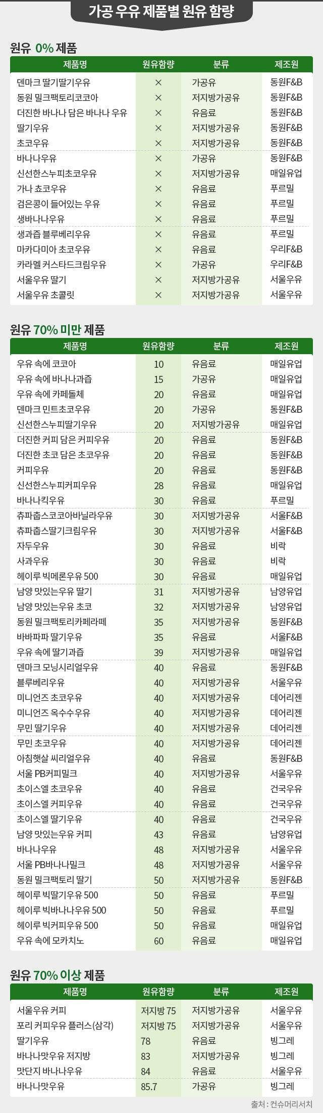 바나나우유 (동원F&B) → 가공유, 원유 없음
