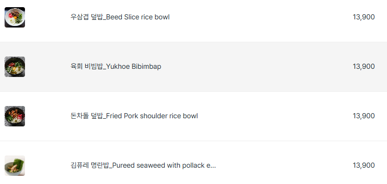 점심 메뉴는 우삼겹 덮밥, 육회비빔밥, 돈차돌 덮밥, 시그니처인 김퓨레 명란밥이 있구요.