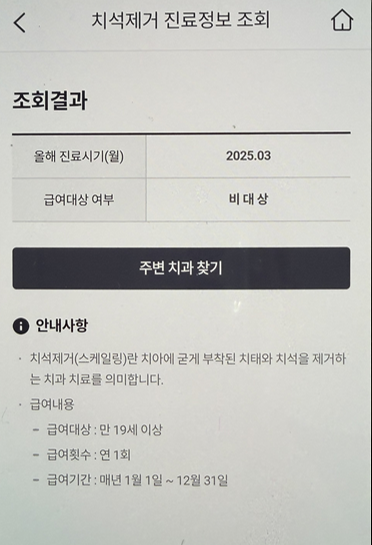 저의 경우 25년 3월에 받았다고 나오네요. 치석제거는 치아에 굳게 부착된 치태와 치석을 제거하는 치료입니다.