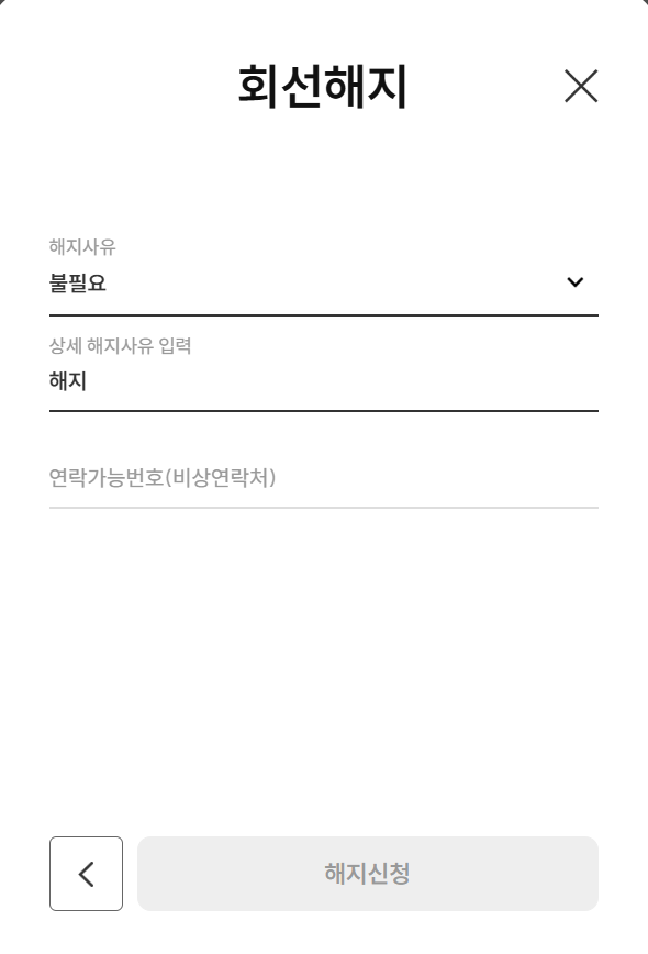 해지번호를 선택하고 해지 사유를 적어야 해지가 됩니다.