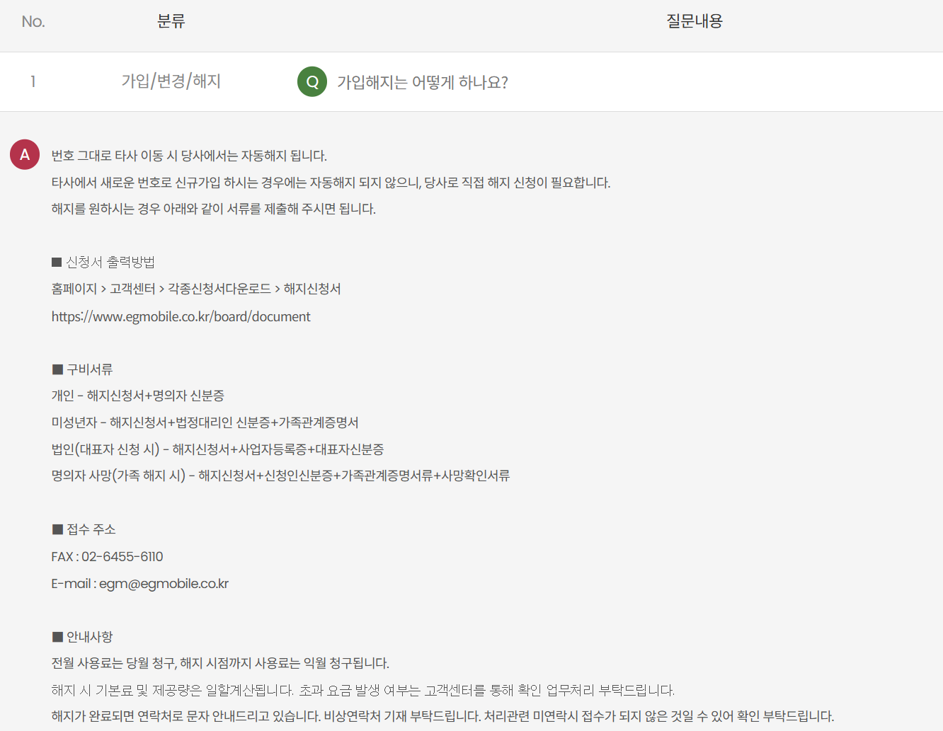 이에 비해서 eg모바일의 경우 메일이나 팩스로 보내야 합니다. 해지하기가 좀더 불편합니다. 홈페이지에서 해지 신청서 받아서 신청하면 된다고 하네요.