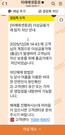 차단 해지를 위해서는 앱에서도 가능한데요. 먼저 미래에셋에서 정한 기준에 따라 평소와 다른 패턴이 발생되면 차단을 한다고 합니다. 즉 해킹이나 보이스피싱 등 전자금융사기 피해를 예방하기 위해, 평소 고객의 거래 패턴과 다른 이상 징후가 보이면 시스템이 자동으로 이체나 출금을 막는 보안 조치라고 할 수 있습니다.