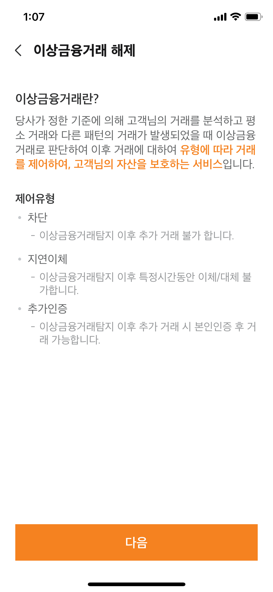 일단 앱에서 이상금융거래 해제 메뉴로 들어갑니다.