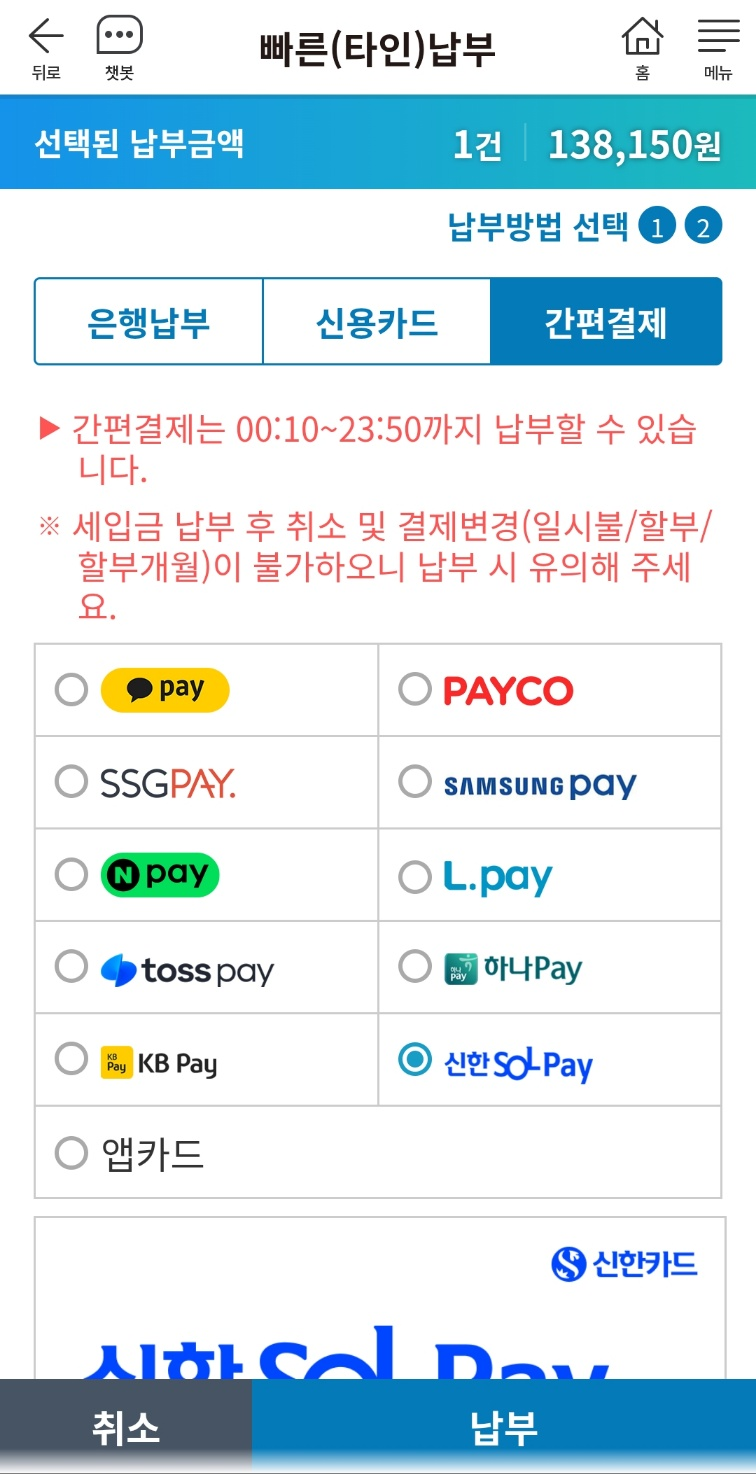 간편결제 등의 방법을 활용해서 편하신 방법으로 납부하시면 됩니다.