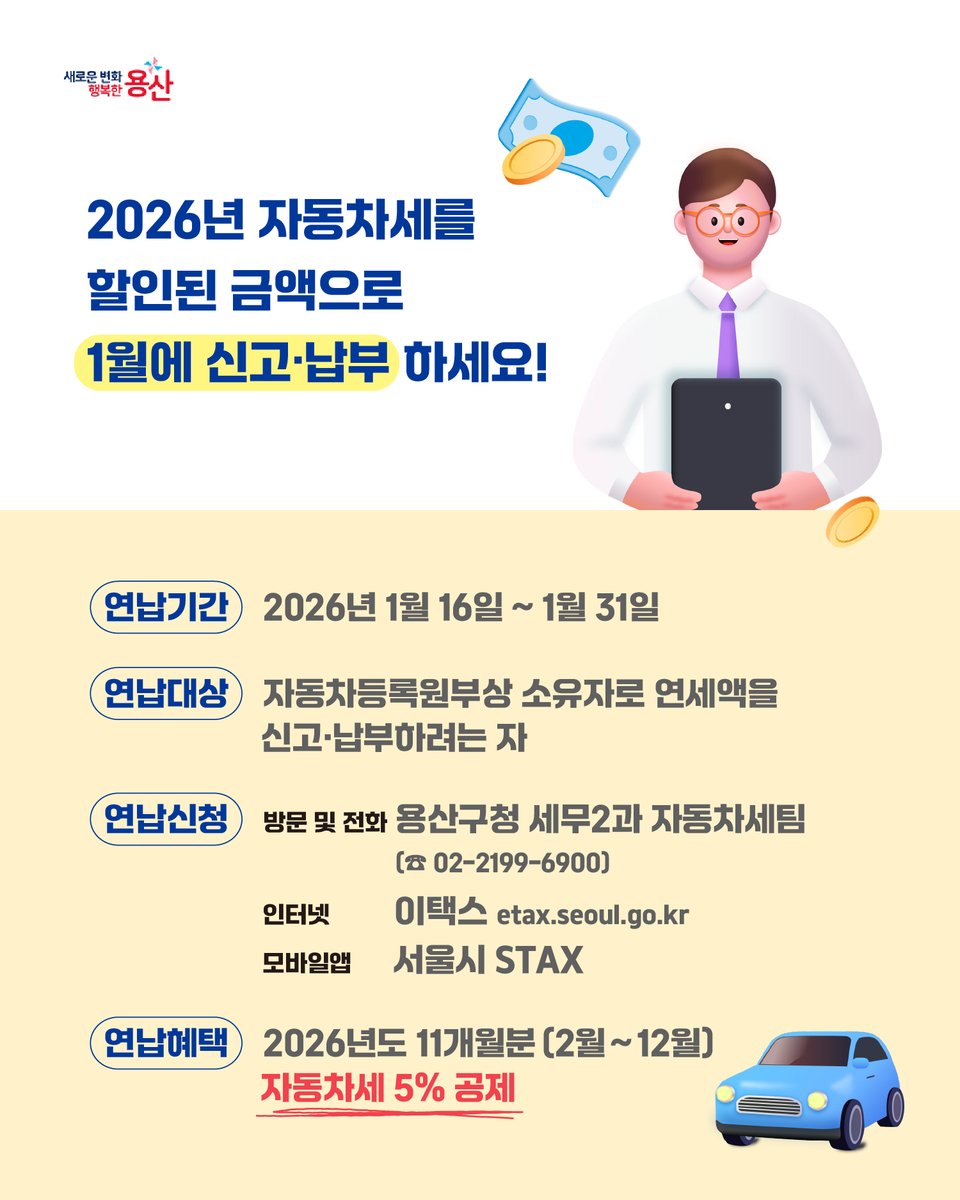 자동차세 연납 할인율은 매년 조금씩 줄어들고 있습니다. 2026년 1월에 납부할 경우의 실질적인 공제율은 다음과 같습니다.
