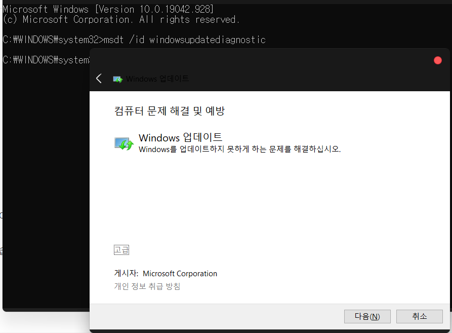 그러면 아래와 같이 윈도우 업데이트 문제 해결사가 실행되고 다음을 누릅니다.
