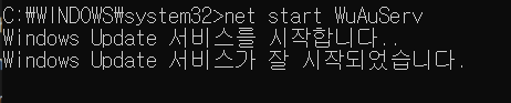 명령 프롬프트 창에 아래 명령어를 통해서 윈도우 업데이트 서비스를 종료합니다.