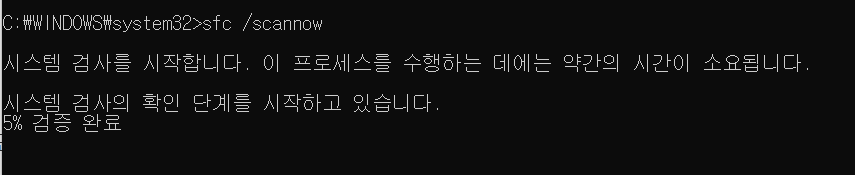이번 경우에도 안되면 윈도우의 시스템을 점검해주는 sfc /scannow를 실행해봅니다.