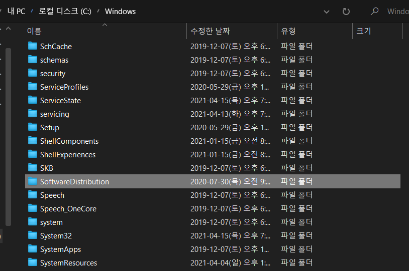 SoftwareDistributuion 폴더의 이름을 다른 폴더로 변경합니다.(Ex. Sold 등)