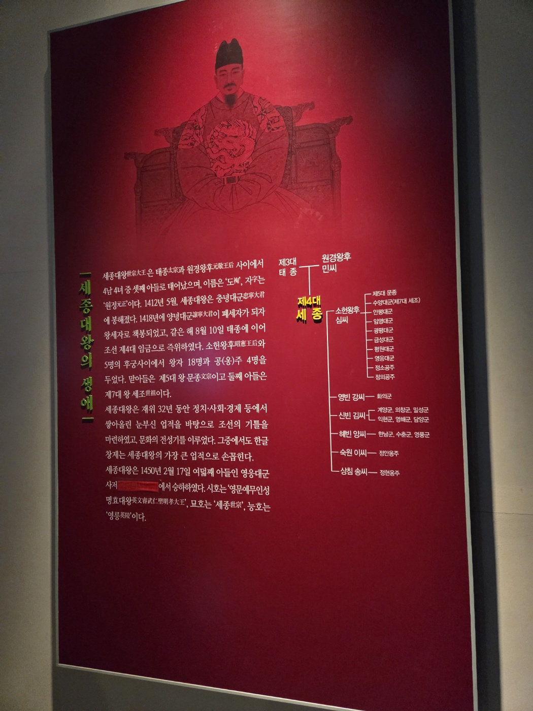 먼저 입구 옆에 잇는 세종대왕역사문화관이 있습니다.세종대왕의 업적(한글 창제, 과학 기술 발전, 음악 등)과 조선 왕릉의 구조에 대해 알기 쉽게 전시해 놓았습니다.