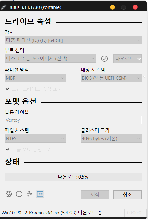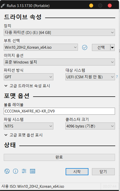실제 다운로드가 다 완료되고 하단의 시작을 누르면 윈도우 10 이전버전 설치 USB를 생성할 수 있습니다.