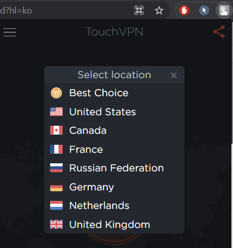새로 추가된 Touch VPN 아이콘을 클릭하시고 국가를 캐나다로 선택해 줍니다.