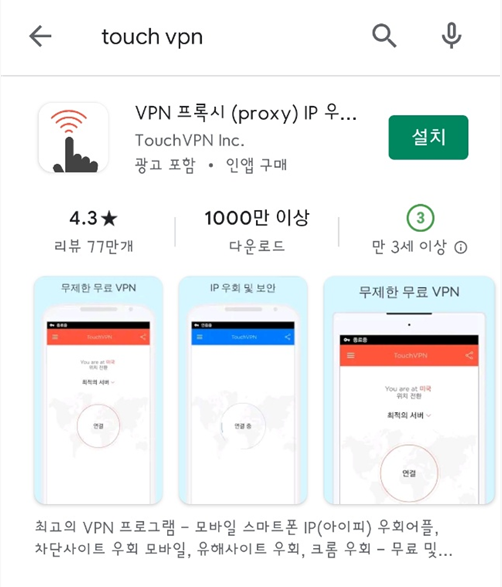 모바일의 경우에는 안드로이드의 경우 touch Vpn 동일한 프로그램을 설치하셔서 진행하시면 됩니다.